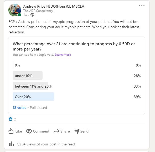 If this unscientific survery is anywhere near the reality, given that the normal recall period for adults is 2 years, that means mearly 4 out 10 myopes will find their prescription changing by a whole dioptre each time they have an eye exam, equivalant to going from 'normal' vision measured at 6/6 to 6/12 or a little worse, at this level most drivers would fail the 'number plate test' and be liable to have their licence instantly revoked on the spot!